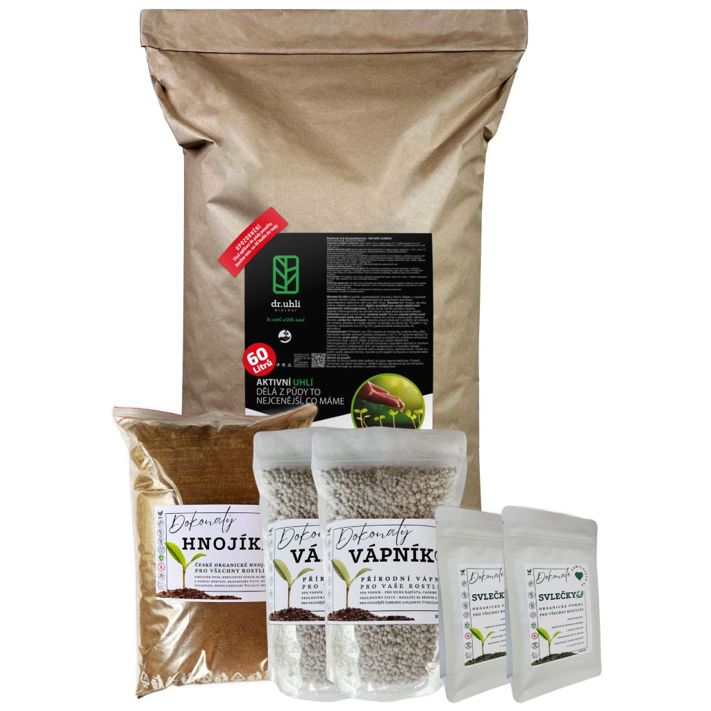 COMPLET SUPER set: Biochar 60 l + Hnojík 4 l + Vápník 2,5 l + Vápník s hořčíkem 2,5 l + Svlečky 0,6 L